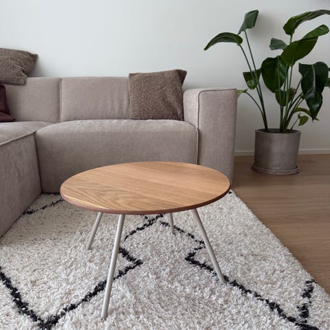 Pyöreä tammenvärinen sohvapöytä, jossa mustat metallijalat.