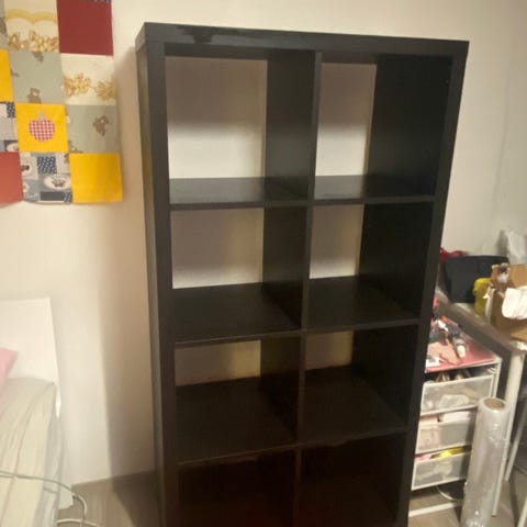 Selling a versatile IKEA KALLAX shelving unit with 8 open compartments arranged in two rows. Color: white.