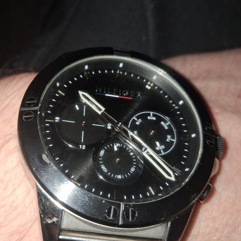 Pidetty yhden kerran. Ainoat jäljet (hiusnaarmut) takapinnassa kellon omasta rannekkeesta.