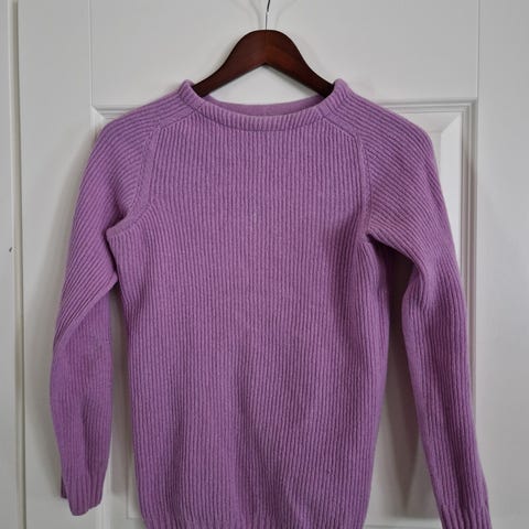 Violetti villasekoitepaita, edessä hieno kukkakirjailu, sekä toisessa hihassa. V-pääntie.