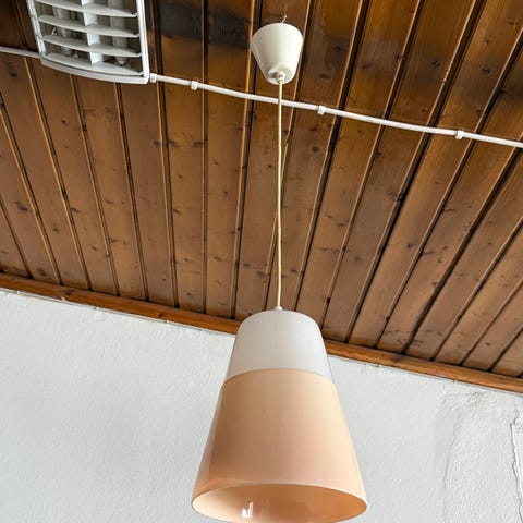 Yki Nummen suunnittelema Kartiot-kattovalaisin. Muovinen varjostin, jossa valo suuntautuu ylös ja alas. Vain nouto Espoon Westendistä.