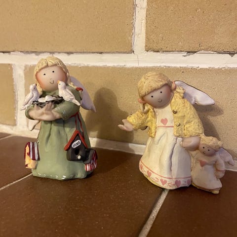 Enkelipatsas, jossa enkeli pitelee lasta sylissään. Patsas on väritykseltään pääosin sininen ja valkoinen, ja se seisoo tummalla pyöreällä jalustalla. Sopii esimerkiksi koristeeksi hyllylle, lipaston päälle tai muistoesineeksi. Oletan että on La Verona collection kokoelmaa. Aika korkea 17 cm.