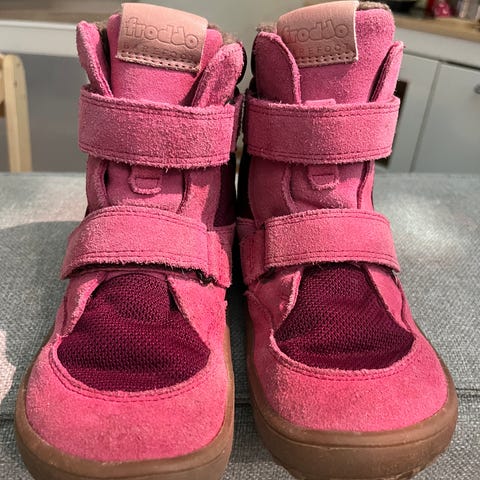 Froddo lasten paljasjalkakengät, koko 28, vk/talvikengät. Ehjät ja tarrat vielä pitävät. Vuori painunut, kantapään kohdalta eniten, tuntuisi kuitenkin vielä ehjältä.