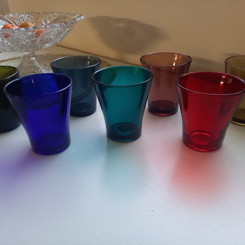 Ohutta lasia, ehjiä, joissain ilmakuplia, 5 kirkasta, 2 harmaata, 1 vaalealiila, 1 tummaliila, 1 sininen