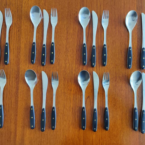 Hyvässä kunnossa olevat aterimet. Lusikat, veitset ja haarukat, kutakin viisi kappaletta. Kaupan päälle saa ylimääräisen lusikan, jossa niitit vähän lonksuu. Lähetyskuluihin varauduttava tuolla hinnalla, eikös vaan.