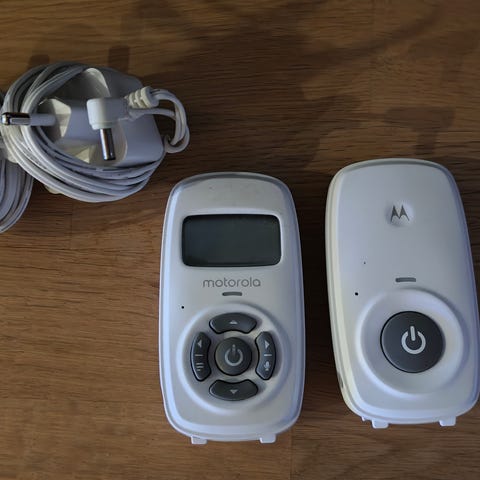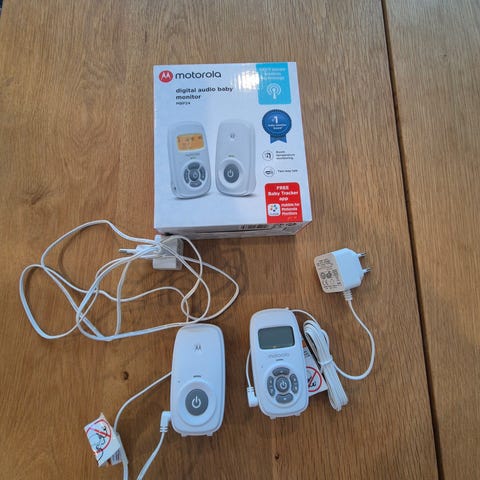 Motorola MBP21 itkuhälytin. Pakkaus sisältää vauvan yksikön ja vanhemman yksikön, virtalähteet ja käyttöohjeet. Vanhempien yksikkö toimii pattereilla tai seinässä kiinni töpselillä, vauvan yksikkö töpselillä.