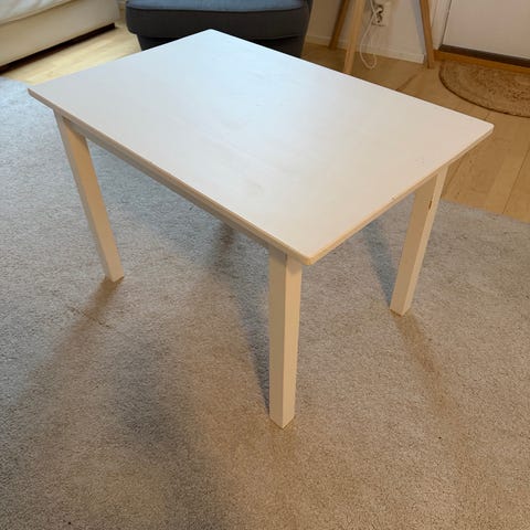 IKEA lasten pöytä, jossa valkoinen suorakulmainen pöytätaso ja puurunko. Pöydän jaloissa on värilliset jatkopalat, jotka voivat auttaa säätämään korkeutta. Sopii lasten huoneeseen leikki-, askartelu- tai läksypöydäksi. Materiaalina puu ja laminoitu valkoinen kansi.