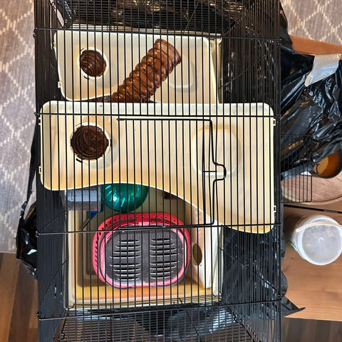 Jyrsijän häkki myynnissä. Meillä ollut hamsterin häkkinä. Kuvassa näkyvät tarvikkeet(puru paketti, ruokakippo, rappuset, juomapullo ja ruuan säilytys purkki) sisältyvät hintaan. Häkin mitat korkeus 62cm, leveys 55cm ja syvyys 38cm. Tasojen alkuperäiset kiinnikkeet mennyt hukkaan, joten olemme korvanneet ne nippusiteillä.