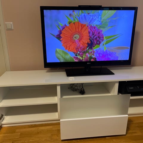 Myydään tv taso jossa vitriinikaapit molemminpuolin. Vitriinit irtonaiset, molemmissa vitriineissä valot jokaisen hyllyn tasolla. Vitriinien alaosissa kaapit hyllyillä. Keskellä ylhäällä kaksi vetolaatikkoa ja alhaalla kaapit. Pientä kulumaa, näkyy kuvissa. Tarkemmat mitat;
