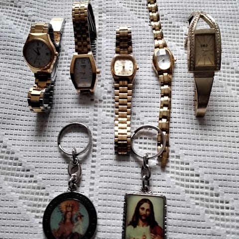 Kolme korttilompakkoa (2 x musta ja 1 x punainen), neljä piikkiä, 2 sydänmuotoista kelloa (rannekkeet hieman kärsineet), komea "timanteilla" varustettu sytytin, 13 kelloa, 3 matkalaukun nimilappua. Kaikki tavarat ovat käyttämättömiä eli uusia. Suoraan kultaseppätukun varastosta. Voidaan lähettää (10euroa).