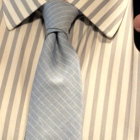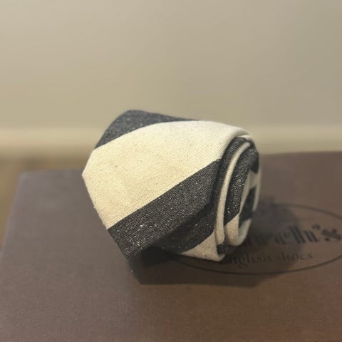 Raita, ns. regimental tie -malli. Tummemmat raidat silkkiä, vaaleammat pellavaa. Kaksi materiaalia rikkoo mukavasti pintaa ja solmio sopii pukujen ja irtotakkien kanssa laajalla skaalalla.