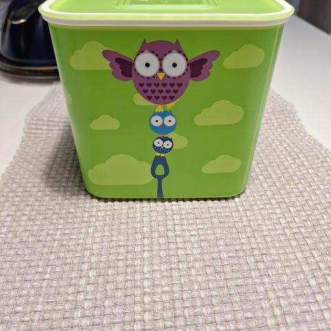 Tupperware säilytysrasia vihreällä kannella. Läpinäkyvä muovinen rasia, jossa vihanneksia esittävä kuvitus sivuilla. Rasiassa on ilmasäätöaukot päädyssä, jotka helpottavat esimerkiksi vihannesten tai hedelmien säilytystä jääkaapissa. Tilavuus 1,6 l. Lev. 14,5 cm, syvyys 22 cm ja kork. 8,5 cm.