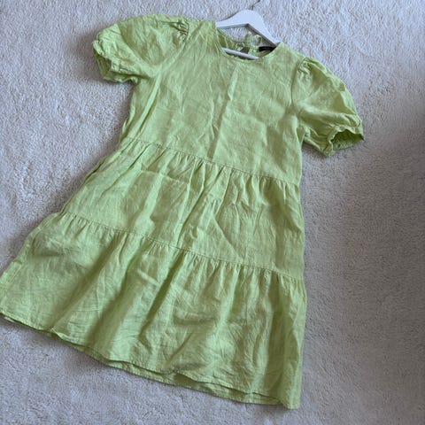 Nanson paitamekko. Ehkä pellavaa/puuvillaa. Kai-kai 49 cm. Pituus 112 cm. Vyö ja taskut. Napit edessä. kaulus ja napitus edessä sekä pitkät hihat. Vyötäröllä on irrotettava solmittava vyö. Sopii arkikäyttöön ja kesäiseen pukeutumiseen.
