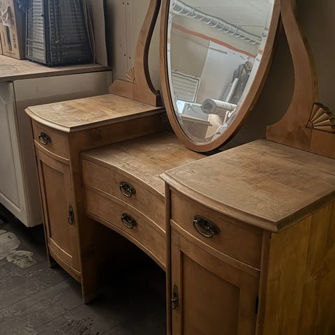 Antiikkityylinen peili ja pöytä kullanvärisellä kehystetyllä peilillä