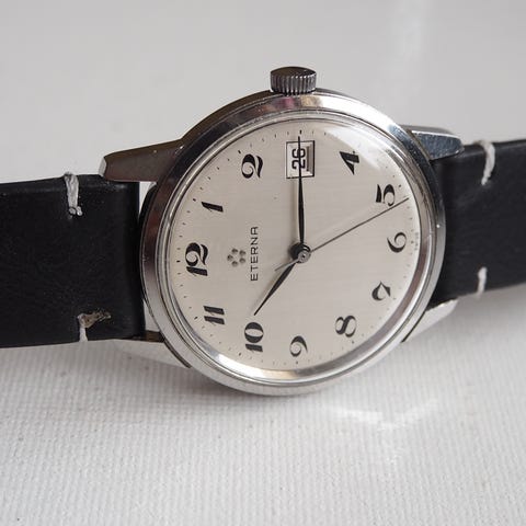 Eterna miesten rannekello. Kellossa on kultainen pyöreä kellotaulu, jossa on viivamaiset indeksit ja päivämääränäyttö kello kolmen kohdalla. Kuori on kullanvärinen. Rannekkeena on musta, krokokuosinen nahkaranneke perinteisellä solkikiinnityksellä. Kello toimitetaan Eterna-laatikossa kuvien mukaisesti.Kellon takana kaiverrus.Kello vaatii uuden pariston. Ei ole ollut käytössä. Tarjoa hinta.