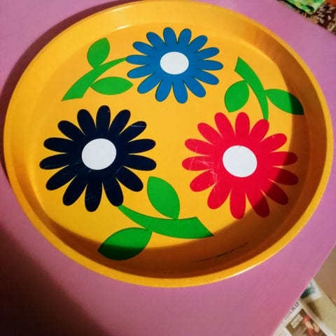Kauniilla kuvioinnilla englantilainen peltitarjotin retron ystävälle. Tarjottimessa näkyy elämän merkit pientä naarmua ym mutta yleisilmeeltään siisti. Aitoa 70 lukua. Tarjottimen halkaisija 30 cm