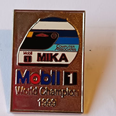 Mobil 1 Mika World Champion 1999 keräilyrintaneula. Metallinen pinssi, Takana perinteinen perhoslukko kiinnitystä varten. Sopii esimerkiksi keräilyyn tai vaatteeseen ja laukkuun kiinnitettäväksi koristeeksi.