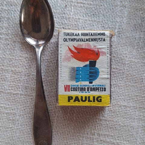 tikkuaski, tulitikkurasia, koko n.5,5 x 3,5 x 1,5cm, " Osaamisen merkit. K Suomen Olympiaurheilun virallinen tukija". Olympialaiset.