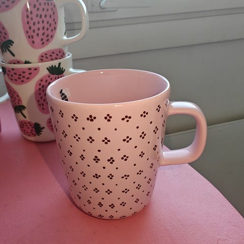 Myyn kaksi Marimekon Oiva-mukia 2,5dl ja -pikkukulhoa 2,5dl Muija-kuosilla. Astiat ovat olleet käytössä, mutta en löydä kunnossa huomauttamista.