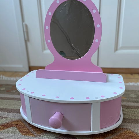 Meikkipöydässä on suuri ovaali peilin paikka (peili osio rikki osaava korjaa) sekä taso pienten tavaroiden ja leikkimeikkien säilyttämiseen. Mukana tulee yhteensopiva jakkara. Soveltuu lasten leikkeihin esimerkiksi lastenhuoneeseen.