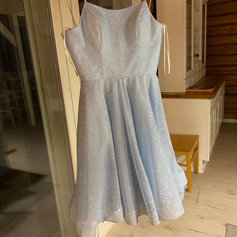 Zazabella rippimekko. Koko 38. Mekko on vaaleansininen ja valmistettu polyesteristä. Malli on olkaimellinen, edestä yksinkertainen ja takaa nyörityksellä säädettävä. Helma on polvipituinen tai hieman sen alapuolelle ulottuva ja levenevä. Materiaali on sileäpintainen ja kevyesti kiiltävä.