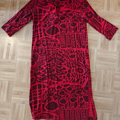 Viskoosikrepistä valmistettu mekko näyttävässä sinisen, pinkin ja oranssin Amur-kuosissa. Väljä malli, venepääntie, polvipituinen helma ja muhkeat hihat. Takana piilovetoketju. Käyttämätön ja erinomainen kunto.