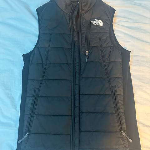 The North Face kevyttoppaliivi / hybridiliivi. Etu- ja takaosa kevyesti topattu, kyljet softshell-tyylistä teknistä kangasta. Toiminut itellä golf- ja ulkoilukäytössä. Koko miesten L. Värinä sininen.