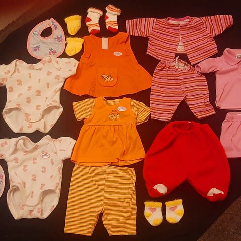Baby Born nuken ykkösvaatteet. Useita erilaisia asuja ja vaatekappaleita Baby Born -nukelle, kuten haalareita, mekkoja ja hameita eri väreissä ja kuoseissa. Pesty ja höyrysilitetty, kuin uusia!