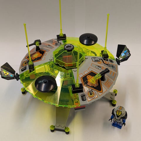 Myynnissä LEGO Space Port -setti 6453 Com-Link Cruiser (1999). Mukana kuvien mukainen ajoneuvo isolla läpinäkyvällä ohjaamolla, tutka-/antenniosat sekä ohjauspaneeli/”tietokone” takana. Mukana myös minifiguuri.