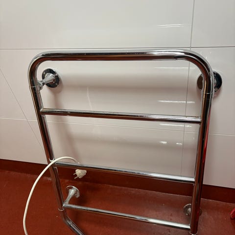 TPK-003 pyyhekuivain kylpyhuoneeseen. Mitat noin 530 x 680 mm. Materiaalina kromattu metalli. Sähkökäyttöinen malli, teho 60 W / 230 V. Virtajohdon pituus noin 1,5–2,0 m. Varustettu ajastimella. Soveltuu pyyhkeiden ja pienten tekstiilien kuivaamiseen ja lämmittämiseen sisätiloissa.