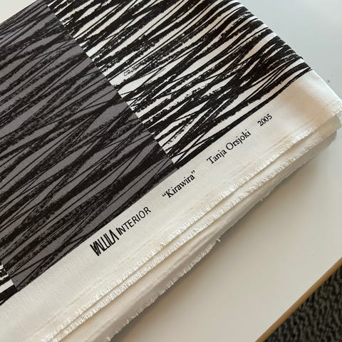 Ompelematon ja pesemätön kolmen metrin (300 cm) pala sini-liilasävyistä Vallilan kangasta. Malva-kuosin on suunnitellut Marjatta Metsovasta (2016)
