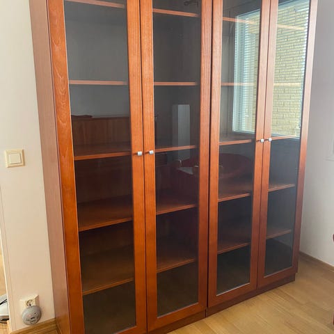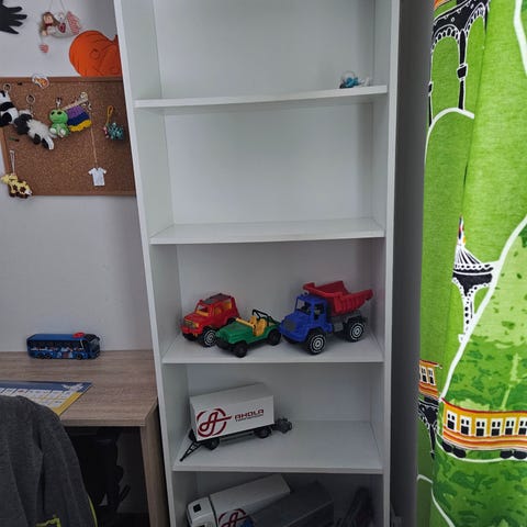 Hyväkuntoinen valkoinen kirjahylly, jossa valot