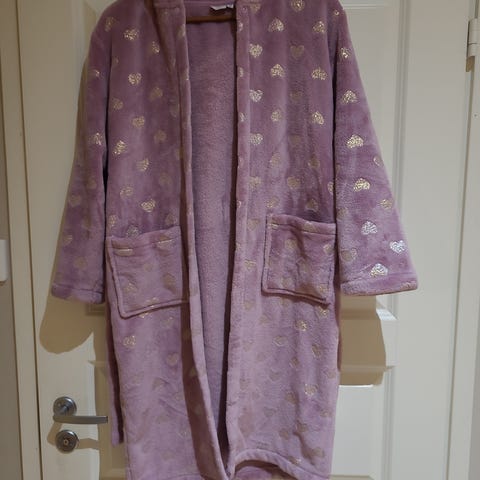 KappAhl bodyzone lasten aamutakki tytöille. Koko 146/152. Väri hento vaaleanpunainen. Materiaali puuvillaa 80% ja 20% polyesteri. Pitkähihainen malli, jossa vyö kiinnitystä varten. Takissa on selkäpuolella koristekuvioita. Sopii käytettäväksi kotona esimerkiksi yöasun päällä tai kylvyn jälkeen.