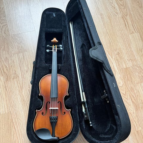 Kokoviulu 1/1 + viulukotelo ja jousi. "Parrot". Valmistettu Kiinassa. Hyvin vähän soitettu.