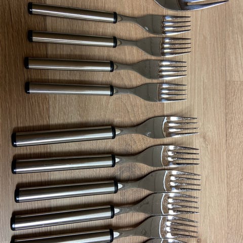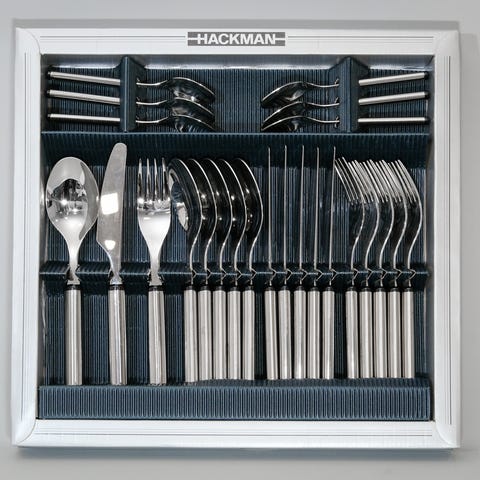 Hackman elegia sarjan lusikat, haarukat, veitset ja pikkulusikat. Valitettavasti yksi haarukka puuttuu.