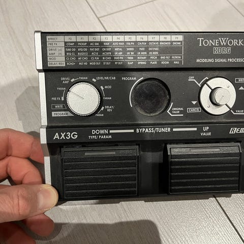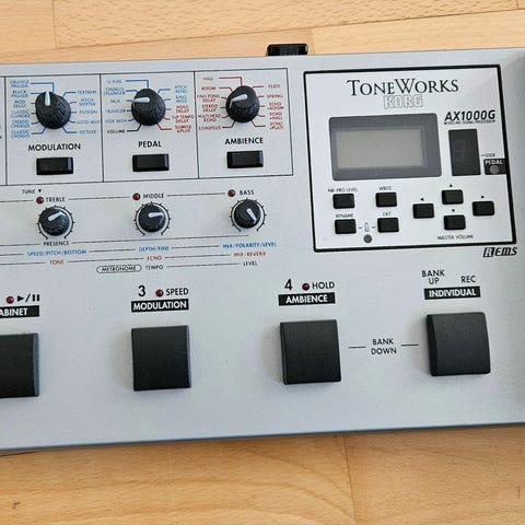 Korg AX10G kitaramultiefekti pedaalilla. Laitteessa on sisäänrakennettu ekspressiopedaali sekä useita säätönappeja ja kytkimiä erilaisten efektien ja asetusten hallintaan. Takapaneelissa on liitännät virtalähteelle, kitaralle ja vahvistimelle sekä lisäliitännät ohjaukseen. Toimii verkkovirtalähteellä tai AA-paristoilla (tarkemmat paristotiedot laitteen pohjassa). Soveltuu sähkökitaran äänien muokkaamiseen ja erilaisten efektien käyttöön kotiharjoittelussa ja treeneissä.