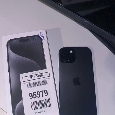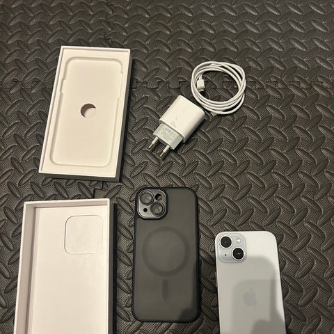 Todella hyvässä kunnossa oleva IPhone 15 puhelin. Akkukapasiteettia on 90%. Tähän pakettiin kuuluu iPhonen omat kuulokkeet.