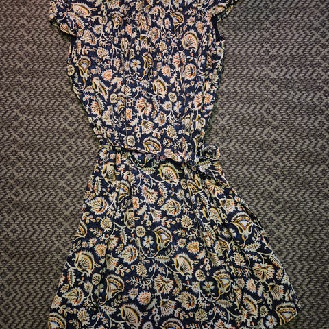 Esprit kesämekko naisille, koko 38. Materiaalina pehmeä viskoosi. Mekossa on kirjava kukkakuosi tummalla pohjalla, pitkät hihat ja kauluksellinen pääntie. Edessä nappikiinnitys yläosassa ja väljä, laskeutuva helma. Sopii arkeen ja vapaa-aikaan.