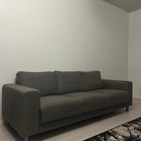 Sohvaa on käytetty alle vuoden. Lapsi on piirtänyt sohvaan kynillä. Taloudessa on myös kissoja.
