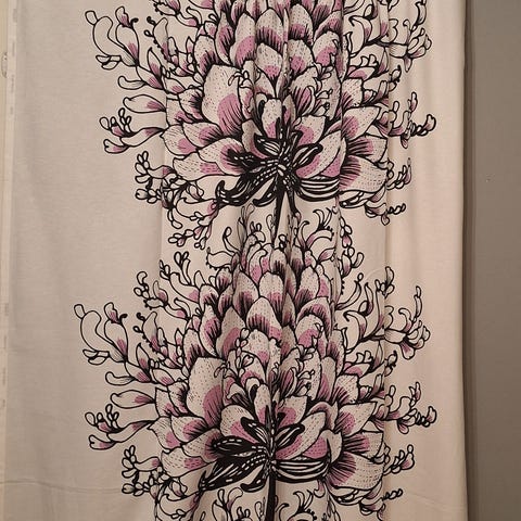 Verhossa on suuria keltaisia kukkia ja tummia ääriviivoja.