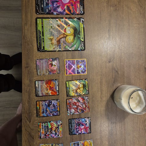 Pokémon TCG V- ja ex -korttierä, jossa useita täysholo- ja erikoiskuvitettuja kortteja kansiosta. Korteissa näkyy muun muassa erilaisia V- ja ex-Pokémoneja eri tyypeistä. Sopii kokoelmaan tai pelikäyttöön Pokémon-korttipeliin. Koko ja tarkka määrä näkyvät kuvista.