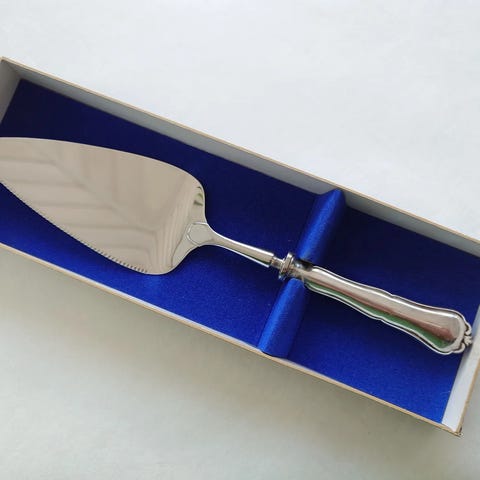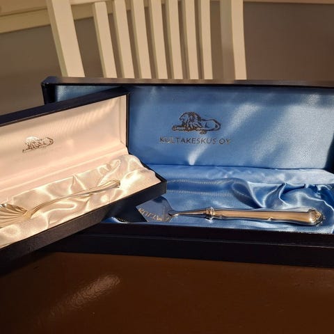 tyylikäs malli, jossa toisessa reunassa pieni sahalaita – sopii erinomaisesti kakun tai piirakan tarjoiluun. Hopeaosassa on kaunis patina, teräosassa käytön jälkiä ja naarmuja