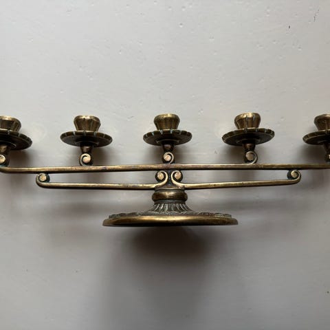 Vintage Jugend tyylinen messinki kynttilänjalka kolmelle kruunukynttilälle. Kynttilänjalassa on pyöreä jalusta ja haaroittuva varsi, jossa kolme paikkaa kruunukynttilöille. Sopii esimerkiksi pöydälle tai sisustuselementiksi.