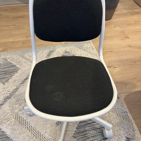 IKEA työtuoli, jossa vaalea kangasverhoiltu istuin ja selkänoja sekä valkoinen, pyörillä varustettu jalusta. Tuolissa on korkeussäätö ja kääntyvä istuinosa. Soveltuu työpöydän ääreen kotiin tai toimistoon. Neutraali vaalea väri ja yksinkertainen muotoilu sopivat monenlaiseen sisustukseen.