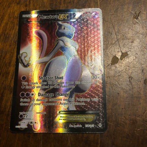 Pokémon Mewtwo keräilykortti, holografinen versio. Kortissa Mewtwo-hahmo, 130 HP ja hyökkäyksinä Psychic ja Barrier. Kortin tausta on violetti holografinen ja reunus keltainen. Takapuolella sininen Pokémon-logo ja Poké-pallo. Soveltuu Pokémon-keräilykokoelmaan tai pelikäyttöön sääntöjen mukaan.