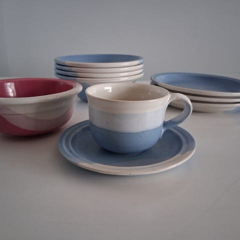 Myydään ylimääräiseksi jääneet siniset kultakeramiikan astioita.