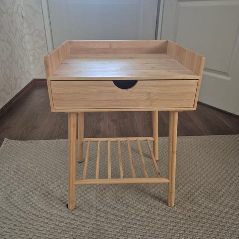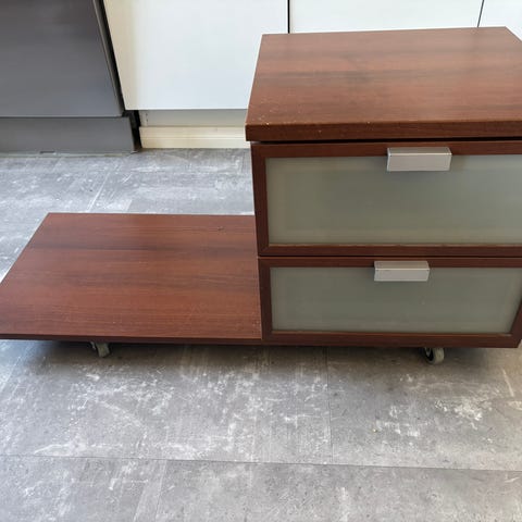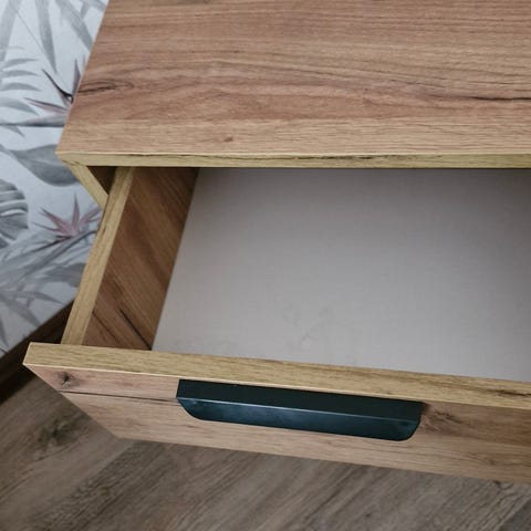 Kuvan yöpöytä kaupan kannessa jälkiä ja laatikon etuosa päällystetty