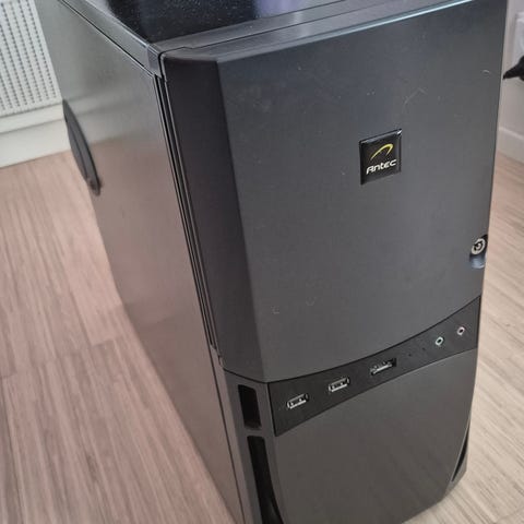 Tietokoneen sisällä näkyy emolevy, jäähdytys, useita liitäntöjä ja laajennuspaikkoja. Musta kotelo, useita USB- ja ääniliitäntöjä takapaneelissa.