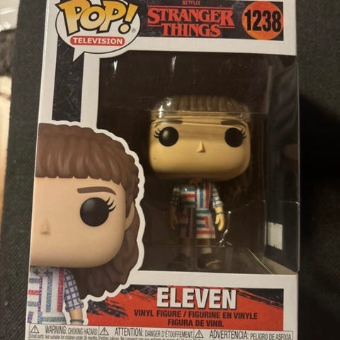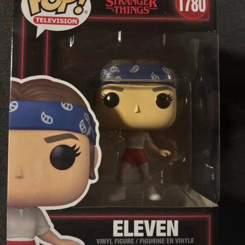 Funko Pop! Television Stranger Things Eleven -vinyylifiguuri, numero 1457. Pakkauksessa on Eleven-hahmo sarjasta Stranger Things. Figuuri on valmistettu vinyylistä ja toimitetaan alkuperäisessä ikkunallisessa rasiassa, jossa on sarjan ja hahmon tiedot sekä kuva muista samaan sarjaan kuuluvista hahmoista. Boxi avattu kerran ja hahmo otettu samalla pois.