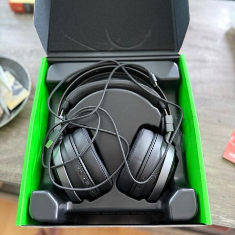 Razer Nari Essential Wireless hesdphones black. The headphones have a padded, adjustable headband and large ear cushions that completely cover the ears. The other ear cushion has a volume control wheel and buttons for controlling the headphones. Suitable for listening to music, gaming and other general use with devices that support wireless audio. The headband cushion shows wear, which should be taken into account when assessing the condition. Comes with a Razer USB connector for the headphones and a Razer charger cable. Feel free to ask any questions :)